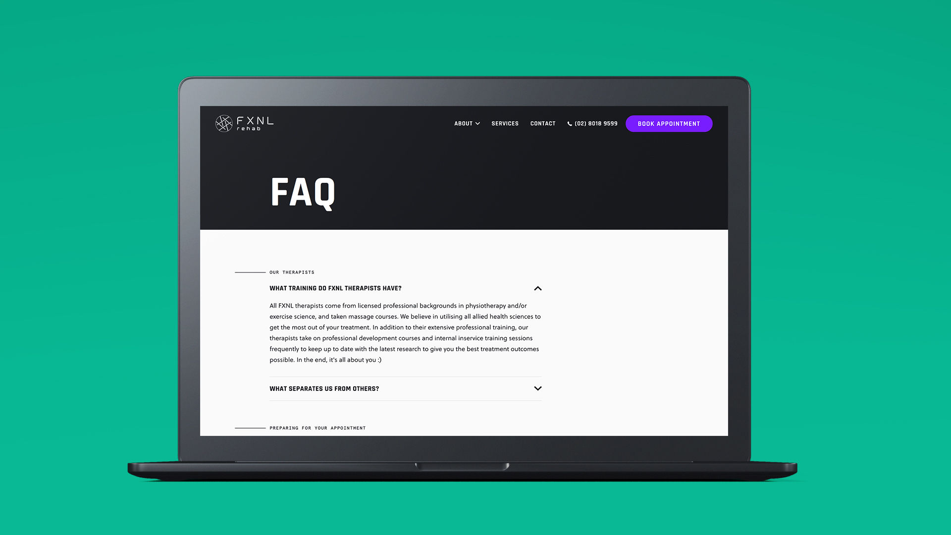 I completed a brand identity for FXNL Rehab, a physiotherapy clinic in Sydney and recently I was tasked with the challenge of designing their website from scratch and optimising the online booking experience. In addition to crafting the UX of the website, I learned how to build the website in Webflow, a visual website builder.